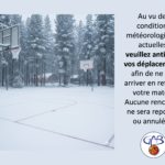 Au vu des conditions météorologiques actuelles, pensez à anticiper vos déplacements afin de ne pas arriver en retard à votre match! Aucune rencontre ne sera reportée ou annulée!!!