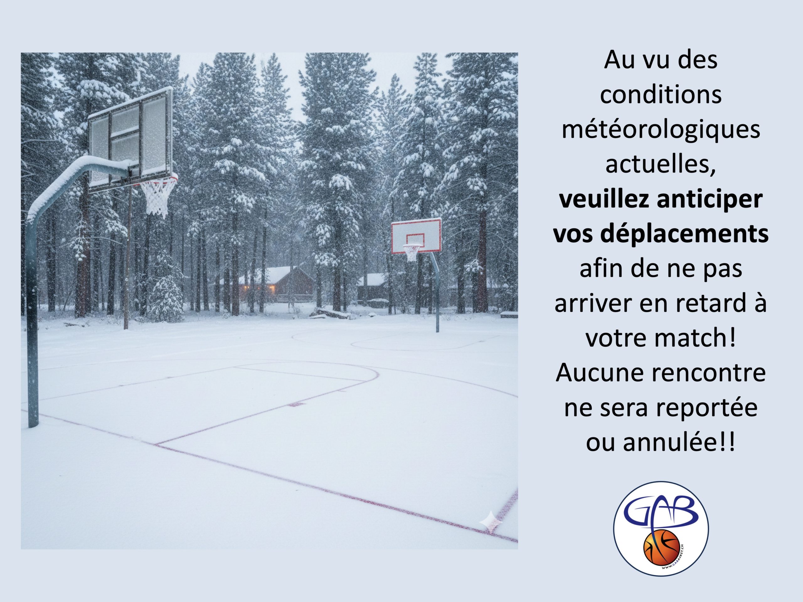 Au vu des conditions météorologiques actuelles, pensez à anticiper vos déplacements afin de ne pas arriver en retard à votre match!